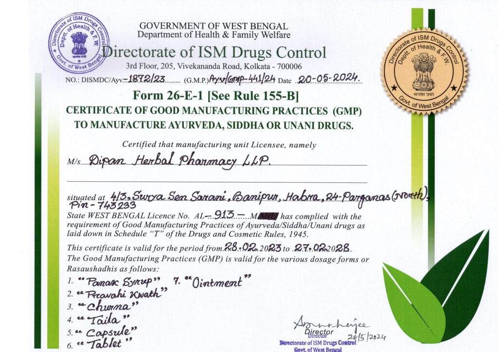 Dipan Herbal Pharmacy is a trusted manufacturer and supplier of high-quality Ayurvedic and herbal medicines, based in North 24 Parganas, West Bengal (India). Established in 2010, we have steadily built a strong reputation in the herbal healthcare industry through our commitment to quality, authenticity, and customer satisfaction. With over a decade of industry experience, we specialize in the development, manufacturing, and supply of a wide range of herbal and Ayurvedic formulations, including cough syrups, tonics, capsules, liquid medicines, powders, and other traditional Ayurvedic products. Our products are formulated using carefully selected natural ingredients and are processed under strict quality control measures to ensure safety, effectiveness, and consistency. We operate a well-equipped production unit with advanced machinery, enabling us to manufacture products efficiently while maintaining international quality standards. All our formulations undergo thorough quality evaluation at every stage of production, from raw material sourcing to final packaging. Dipan Herbal Pharmacy is an ISO 9001:14001 and ISO 9001:2015 certified company, reflecting our strong focus on quality management systems and environmental responsibility. Our experienced research and development team continuously works to improve formulations and introduce effective herbal solutions aligned with traditional Ayurvedic principles and modern healthcare needs. We cater primarily to bulk order requirements, serving wholesalers, distributors, and institutional buyers across various regions. Competitive pricing, timely delivery, and consistent product quality have helped us build long-term relationships with our clients. Why Choose Us Over 10 years of industry experience ISO-certified quality standards Skilled professionals and expert R&D team Advanced production infrastructure Strict quality assurance at every stage Competitive pricing for bulk orders Reliable supply and timely delivery At Dipan Herbal Pharmacy, our mission is to promote natural healing through authentic Ayurvedic products while maintaining the highest standards of quality, ethics, and customer trust.