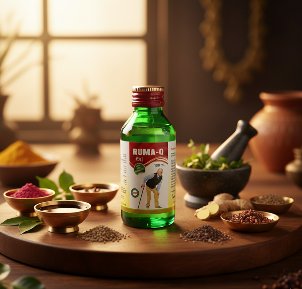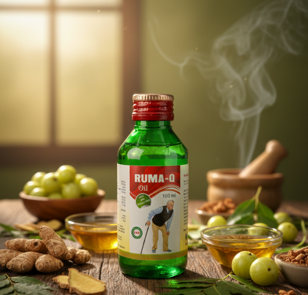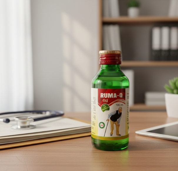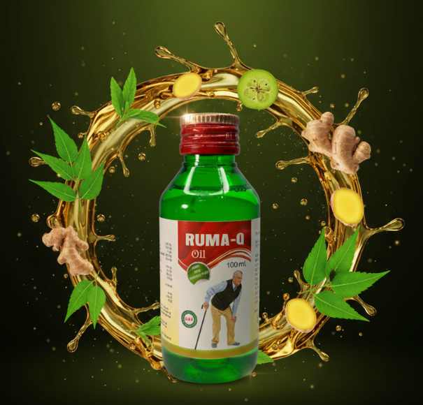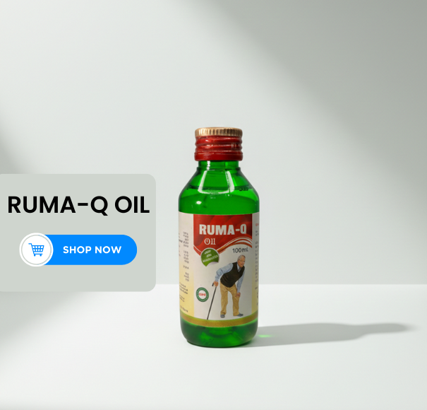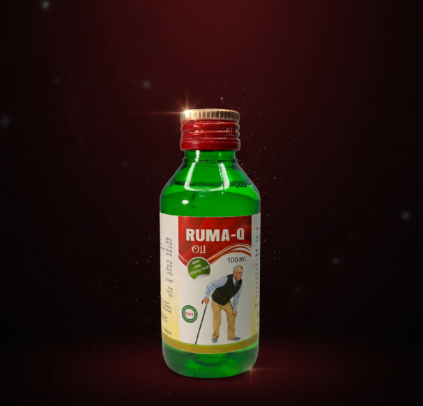 RUMA-Q Oil is a carefully crafted herbal oil designed to support relief from joint pain, muscle soreness, and stiffness caused by daily strain, aging, or physical exertion. Enriched with time-tested Ayurvedic herbs, this oil penetrates deep into the affected area to provide soothing warmth and long-lasting comfort.